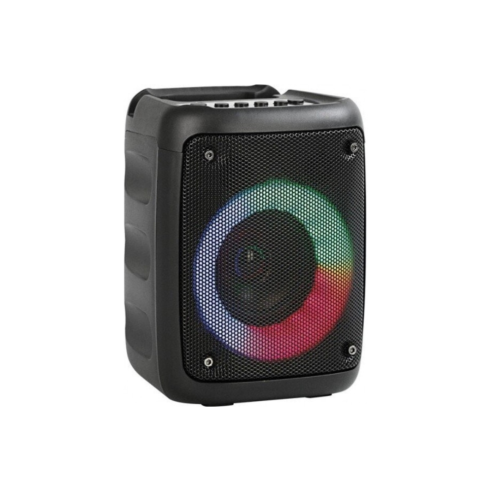 Rebeltec Stage 180 - fekete bluetooth hangszóró. Okostelefonnal (Bluetooth) vagy beépített gombokkal vezérelhető. Kompatibilis a Bluetooth 5.0-val. 18W RMS teljesítmény. Használati idő: 5 - 7 óra. Hangszóró mérete: 75mm (3"). Módok: Bluetooth, FM rádió, USB pendrive, microSD kártya, AUX, KARAOKE. Többszínű RGB háttérvilágítás több módban (ki is kapcsolható). Beépített Li-Ion 1500mAh 3,7V akkumulátor (MicroUSB-vel töltve, kábel a csomag része). GRP - két azonos hangszóró csatlakoztatásának képessége. 6,3 mm-es monó mikrofon csatlakozó; microSD kártyanyílás, amelyből mp3 fájlokat játszhat le; USB-aljzat, amelyhez MP3-as USB flash meghajtót csatlakoztathat. AUX (külső hangforrásból 3,5 mm-es mini jack kábelen keresztül). AUX kábel szinté a csomag része. Méretek: 180 x 135 x 125 mm. Nettó tömeg 595 g.