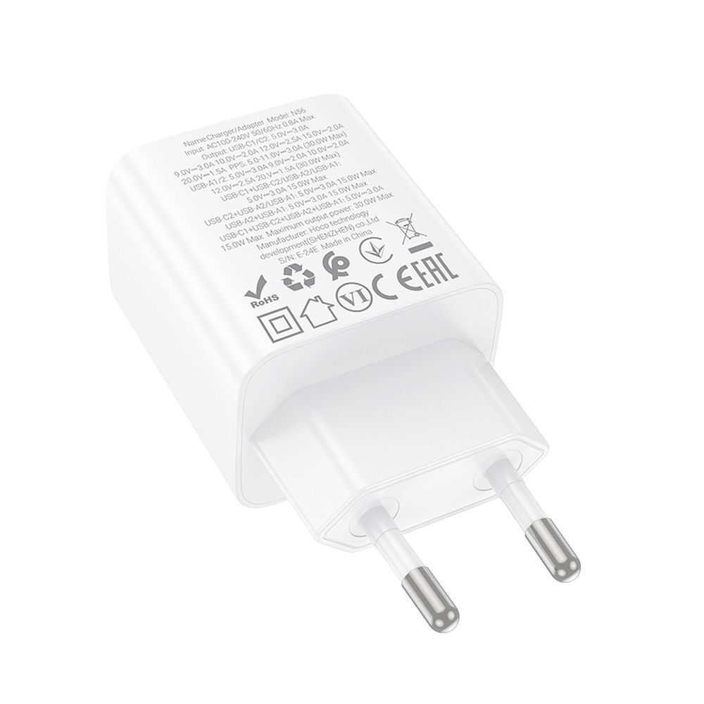 A gyorstöltéssel és négyszeres kimenettel rendelkező Hoco N56 fali töltő lehetővé teszi a mobileszközök gyors töltését. A töltő négyszeres kimenettel van ellátva: 2XUSB / 2XType-C (USB-C). A termék támogatja a PD20W / PPS / QC3.0 / QC2.0 / FCP / AFC / SCP és más gyorstöltési protokollokat A PC-ből készült töltő kivételesen tartós és ellenáll a sérüléseknek. Az intelligens érzékelés biztosítja az egyes eszközökhöz tartozó megfelelő áramerősség beállítását.