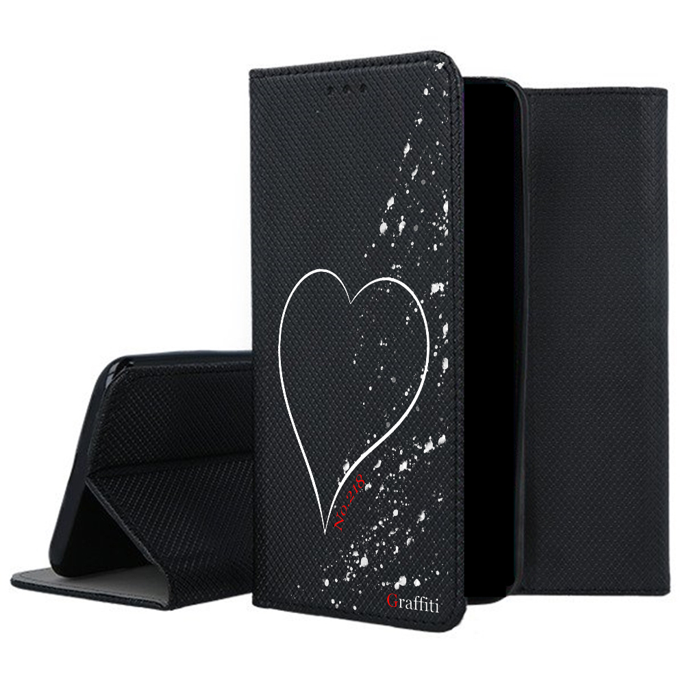 Eredeti Graffiti Kitámasztható könyvtok, pénz- és bankkártyatartóval. Fekete könyvtok egyedi sorszámozott mintával a Graffiti-Brand által tervezett black&white stílusban, mely tökéletesen illeszkedik a készülék csatlakozóihoz, gombjaihoz.