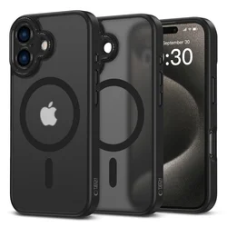 Telefontok iPhone 16 - MagSafe kompatibilis áttetsző műanyag hátlap tok, fekete szilikon kerettel, kameravédővel