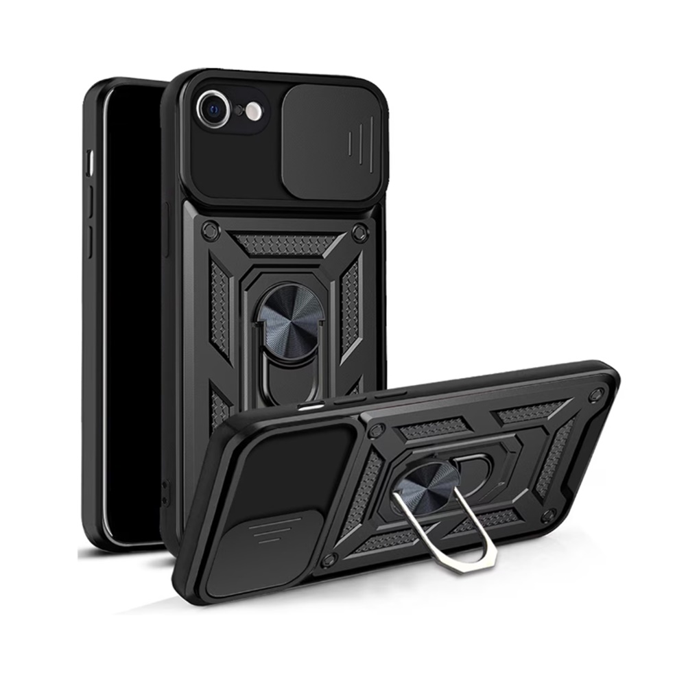 Telefontok iPhone 17e - Camshield - fekete szilikon tok, kitámasztó ujjgyűrűvel, csúsztatható kameravédővel