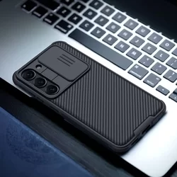 Samsung Galaxy S23 Telefontok - Nillkin csúsztatható kameravédős fekete hátlap tok
