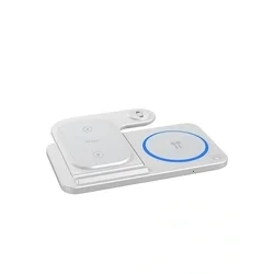 A 3 az 1-ben összecsukható vezeték nélküli töltő lehetővé teszi telefon, okosóra és TWS headsetek induktív töltését. Akár 15W teljesítményigényű eszközökhöz tervezték. Töltsön több eszközt egyetlen tartozékkal! Ez sok helyet takarít meg, mivel csak egyetlen töltőállomást kell használnia az összes eszköz töltéséhez. A termék finom fényhatással rendelkezik, és sötétben is jól látható. Teljesítmény: 5W/7.5W/10W/15W. Kérjük, hogy a megrendelés előtt, mindenképpen ellenőrizze, hogy az Ön eszköze / eszközei alkalmasak-e a vezeték nélküli töltésre!