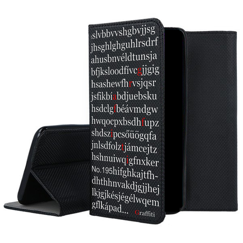 Eredeti Graffiti Kitámasztható könyvtok, pénz- és bankkártyatartóval. Fekete könyvtok egyedi sorszámozott mintával a Graffiti-Brand által tervezett black&white stílusban, mely tökéletesen illeszkedik a készülék csatlakozóihoz, gombjaihoz.